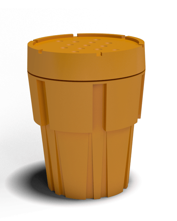 Materiales: Tapa con ranuras para un efectivo cierre. Molde con rebordes para facilitar el enganche y manejo. Su boca permite el acceso de garfios para levantar el envase de su interior. 100 % polietileno con U.V. Resistente a la corrosión.